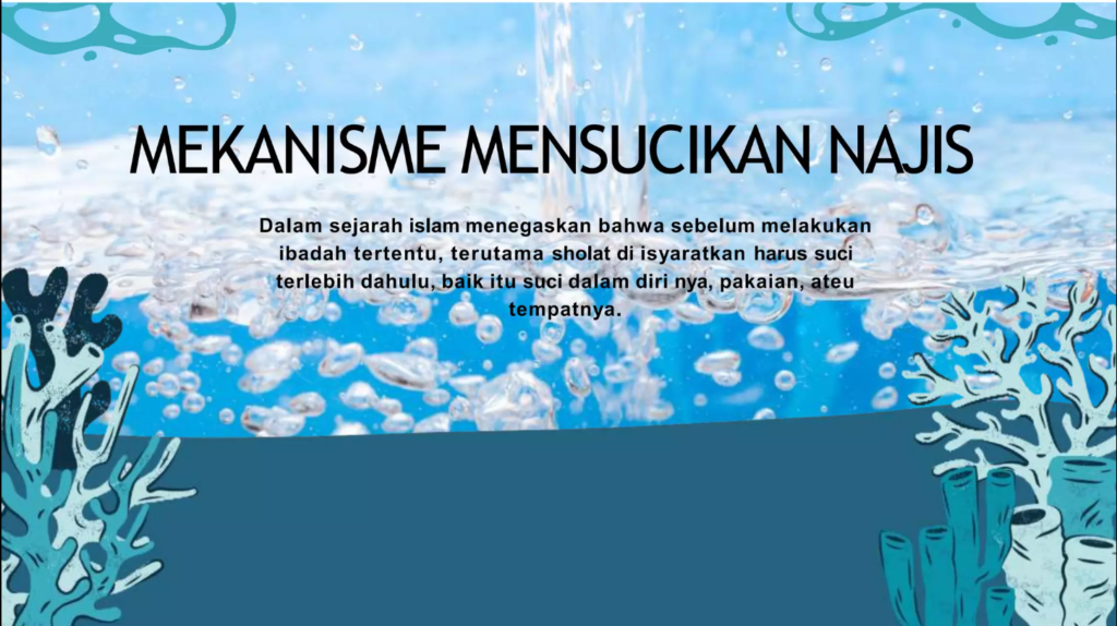 Materi “Mekanisme Mensucikan Najis” membahas tentang konsep najis dalam Islam, menjelaskan bahwa najis adalah segala sesuatu yang kotor yang membatalkan ibadah jika masih menempel, lalu menguraikan tiga jenis najis (ringan, sedang, dan berat) beserta cara penyucian masing-masing menurut fiqih.