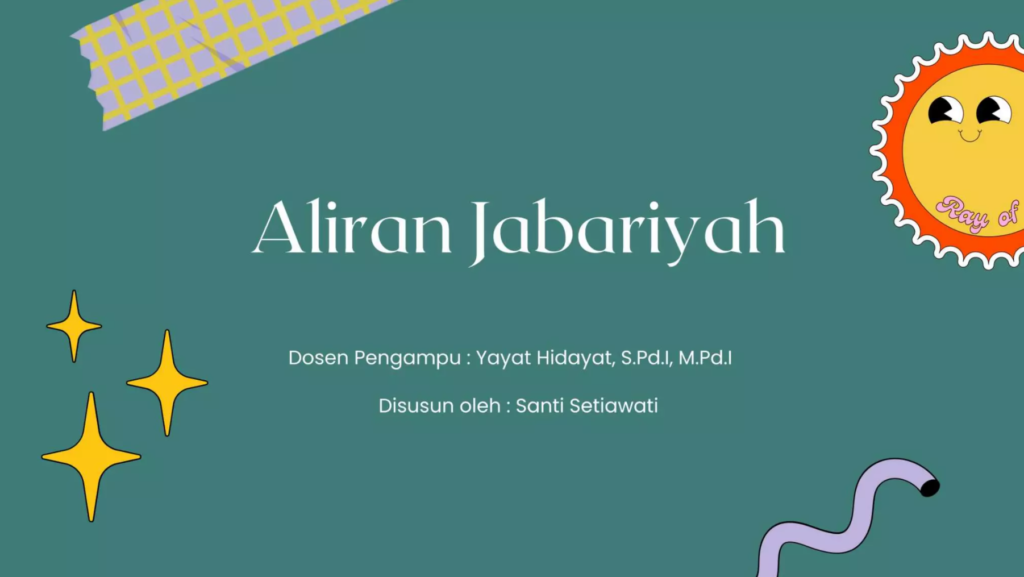 Materi presentasi “Aliran Jabariyah” menjelaskan bahwa Jabariyah adalah aliran teologi Islam yang menegaskan bahwa semua perbuatan manusia sepenuhnya ditentukan oleh kehendak dan takdir Allah SWT, sehingga manusia tidak memiliki kebebasan atau kehendak bebas dalam memilih tindakannya.